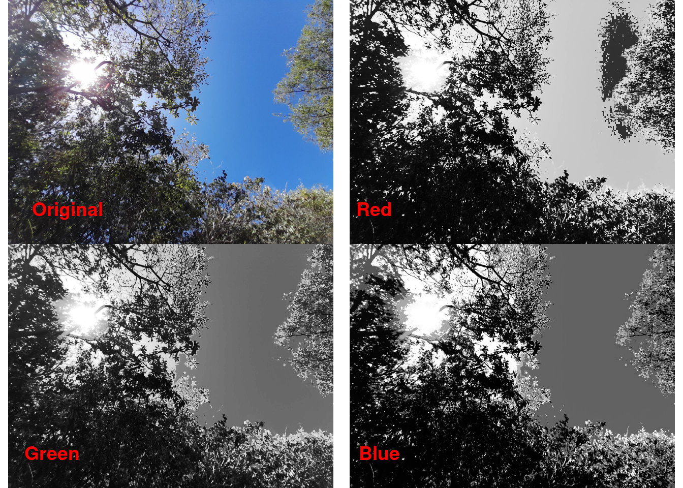 - O canal azul é preferido porque permite um maior contraste entre os pixels do céu e do dossel
